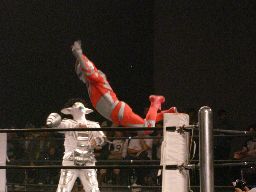 試合前に尾内淳が海上の森にモリゾーを探しに行くと称してだみあん武田と遊ぶ映像。イマイチ意味がわからん。で、「モリゾーを捕まえた」と段ボール箱が映る。その後にメカマミーLiteがリングイン。また映像。武田が「大変です!モリゾーだと思って捕まえてきたのが実は宇宙怪獣でした!尾内さん、何とかしてください!」メカマミーLiteは宇宙怪獣なのか?カレーを食べていた尾内はそのスプーンで変身しようとするという初代ウルトラマンネタの後、ウルトラアイで変身(左写真)。この最後のシーンだけで十分だったのではなかろうか。