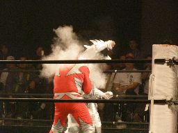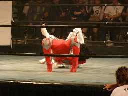 コーナーに上ると450°スプラッシュ(右写真)、レフェリーがいないため当然ノーカウント。