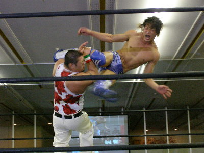 館内案内図を見ても「イベントホール」というのがない。たまたま会った別の東京組の人が会場に電話をかけると、イベントホールはジャスコ(Wonder City本館)ではなく駐車場脇の別棟「Wonder Square」らしい。また駐車場を突っ切って駅の方に戻る。これだけ離れてると「ジャスコ乱闘」はないなあ。Wonder Squareに着くといかにもプロレス客な集団がいてそこが会場だと判明。13時30分。早めに来といてよかった。