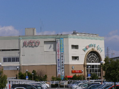 さていよいよ試合会場だ。上前津で名城線から鶴舞線に乗り換えて終点の上小田井に。駅周辺図に会場の「ワンダーシティ」が載ってるが、見渡せる範囲にはない。ちょっとあるのかな?その方向に歩き出す。人が結構歩いてるから方向は間違ってないようだ。突然大駐車場の向こうにジャスコが。その壁に「Wonder City」の文字。ジャスコの中でやるのか?駐車場を突っ切ってジャスコに。