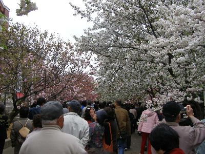 新大阪には14時20分の着。会場のアゼリア大正には19時に行けばよい。せっかくこの時期の大阪、しかも平日に来たので有名な造幣局の「桜の通り抜け」に行くことに。新大阪から京都線で大阪、大阪で東西線(北新地)に乗り換えて大阪城北詰下車。駅出たとこからもう列ができてるよ。ツアーが多いな。川べりのソメイヨシノはもう終わりかけていたが、「桜の通り抜け」はソメイヨシノではなくいろんな種類の桜を造幣局の庭に集めていて、期間中のみ(今年は13日〜17日)それを公開しているというもの。