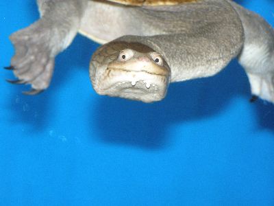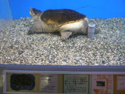 カミツキガメ。道を歩いてたところを警察が保護しこの水族館に来た捨て亀らしい。