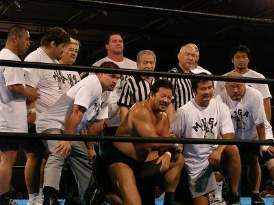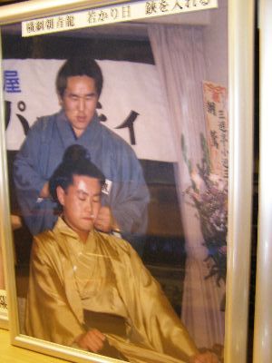 これは朝鷲(大鷲透)の断髪式の模様かな?後ろは朝青龍。