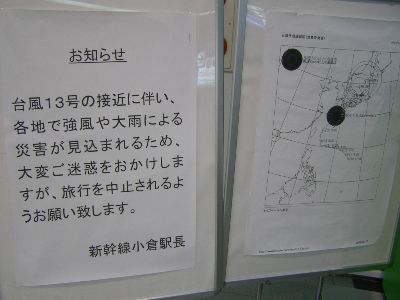 小倉駅で新大阪行きの指定席をなんとか確保。いよいよ台風が接近し、熊本・長崎方面行きの特急は運休になったらしい。しかし「旅行はおやめください」という張り紙は珍しい。