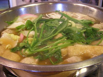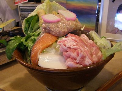 鍋に入れるとこの様子。つみれが特に大量。しかしすりごまと唐辛子の入った器にだしを入れて食べると、ちょっとピリ辛なのが食欲をそそり、なんとかうどん以外は完食。まだいた知り合い達にかなり驚かれる。「一人前」とは「力士の一人前」なのだそうだ。