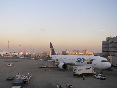 ようやく白みがかる羽田空港。今回搭乗機はスカイマーク。7時50分発。