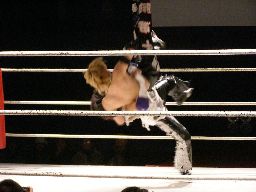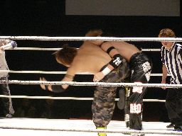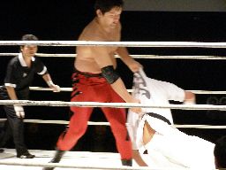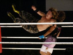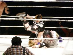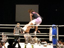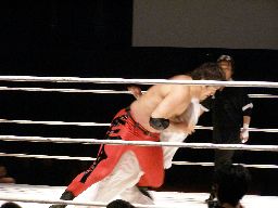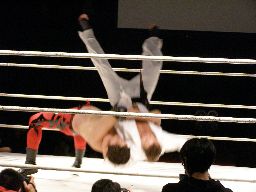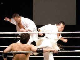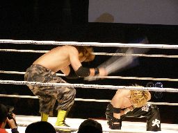 そのまま両腕をロック(右写真。名前知らん)、726がカット。isamiトラースキック、コーナーに上げて雪崩式ブレーンバスター狙う、怨霊逆に持ち上げて場外に投げ捨てる。15分経過。
