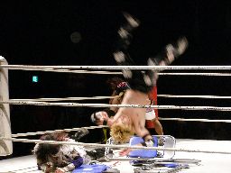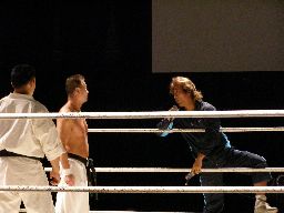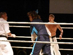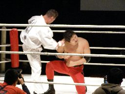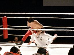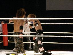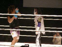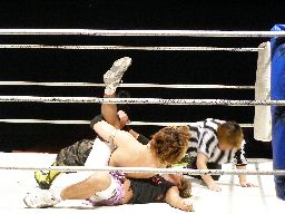 裕向入ってダブルのショルダーブロック、裕向逆片エビ、isamiロープ。裕向とisamiチョップの打ち合い(左写真)裕向その場飛びニールキック、見事isamiの顔面にヒット。10分経過。