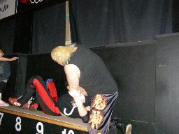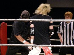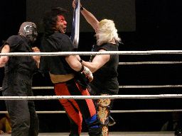 雁之助は奴隷1号とタッチ。奴隷1号はコーナーでポイズンを踏みつけ。チェーンを拳に巻きつけてパンチ。バックドロップ(左写真)からカバー、isamiがカット。