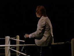 ボディスラムでコーナー下に投げてその上にイスを積む、コーナーに上ると自分も痛いスワントーン・ボム(右写真)、カバー、カウント2。15分経過。