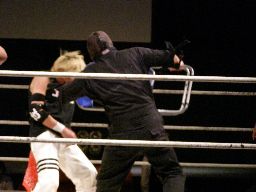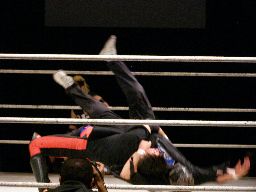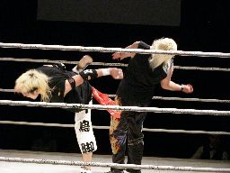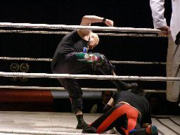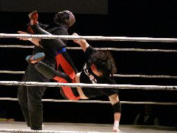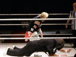 isamiが入ってミサイルキック(右写真)、奴隷1号をコーナーに振って串刺しニーアタック。