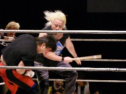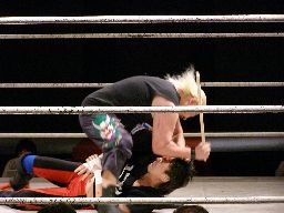 奴隷1号エルボー、ロープに振る、isamiエルボーかわしてアックスボンバー(左写真)、ポイズンにタッチ。