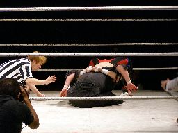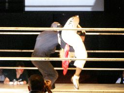 雁之助はポイズンの顔面をトップロープでこする(右写真)。ボディスラムからカバー、カウント2。奴隷1号にタッチ。