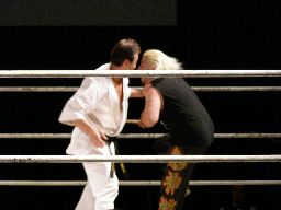 ポイズンは4発目を両手でブロックするとエルボー、エルボー連打からローリングエルボー(右写真)。