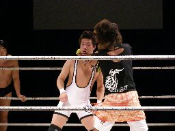 泉州ボディスラム2連発、カウント2。佐藤チョップ打って行く(右写真)、泉州返す。泉州ロープに振ってエルボー、佐藤かわしてドロップキック、726にタッチ。5分経過。