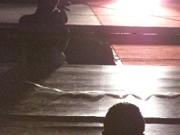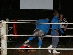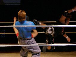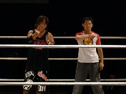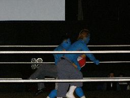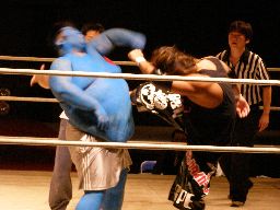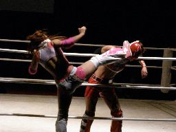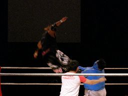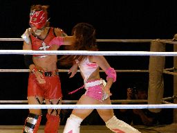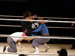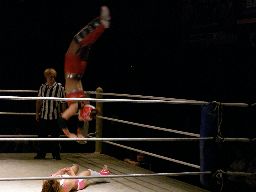 零はコーナーからトップロープ上で側転しての両足キック(右写真)。これが「キャンドル」?これはいい技だ。カバーはカウント2。零コーナーに上ってミサイルキック、チェリースカす。