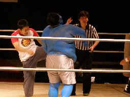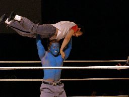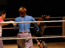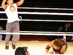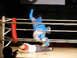 ドメルがボディスラムからコーナーに上ってセントーン、趙雲かわす(右写真)。