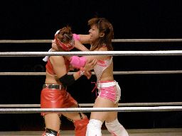 零バック取る、チェリー切り返す、零さらに切り返す、チェリーサムソンクラッチで丸め込もうとするが頭から落ちる。強引に丸め込むがカウント2。チェリー起き上がってジャンピングネックブリーカードロップ3連発(右写真)、カウント2。5分経過。