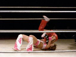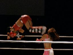 チェリーダブルリストアームサルト狙う、零ブロック。チェリーはロープに押し込むと反動使ってダブルリストアームサルト(右写真)、カウント2。チェリーコーナーに上る、零は首投げで引きずり落とす。零ミサイルキック。