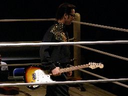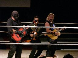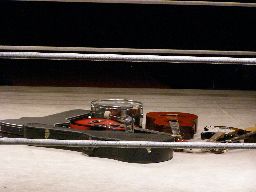 ベンチャーズにまつわる凶器ということでリングに集められたアコースティックギター、エレキギター、ギターケース、ドラム、バスドラのペダルなどなど(左写真)。スクランブルバンクハウス形式でカウントダウンでリングインする方式。BGMにはベンチャーズの曲が。悲壮感も緊迫感もなし。