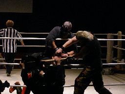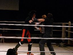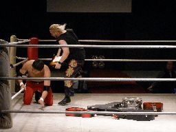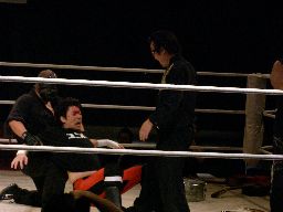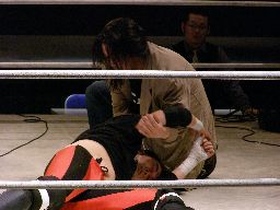 石川が入り奴隷壱号に水車落とし、雁之助にはチョークスラム(右写真)。