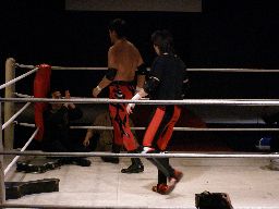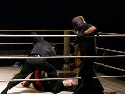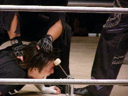 奴隷壱号がパンチ、ヘッドバット連打(右写真)。