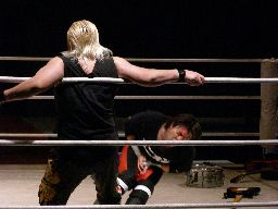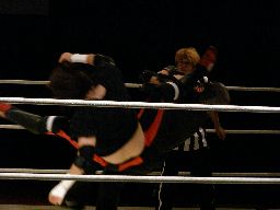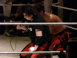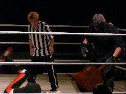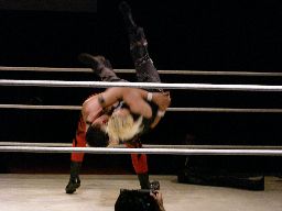 雁之助がコーナーに上って3人がかりでスーパーパワーボム(左写真)、ポイズン自力でキックアウト。
