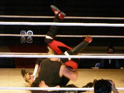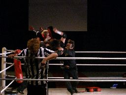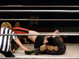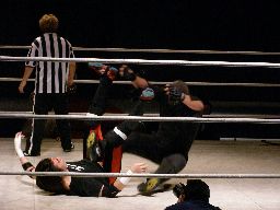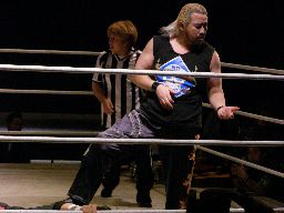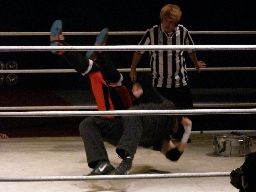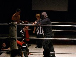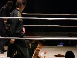 奴隷壱号バックドロップ(左写真)、カウント2。5分経過。