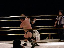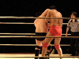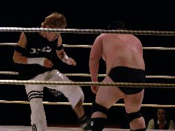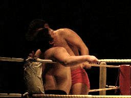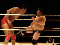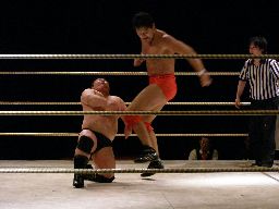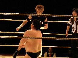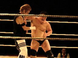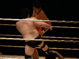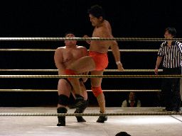 先発は石川とイハシ。イハシローキック、石川エルボー、イハシもエルボー(右写真)。しかし石川がでかすぎる。