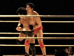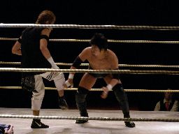 isami首投げからサッカーボールキック(左写真)、イハシもやり返す。