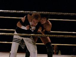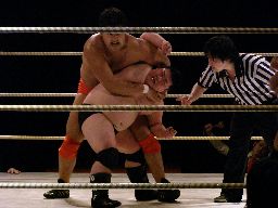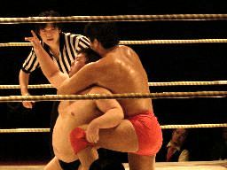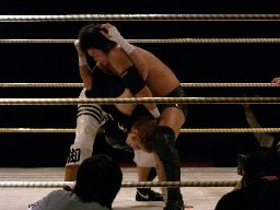 isamiと澤は張り手の打ち合い、澤が変形の卍固めに(右写真)。石川がカットに入るがイハシがヒザ十字に捕らえる。isamiロープ。
