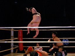 石川を呼び込んでサイド串刺しニーアタック、石川も串刺しニーアタック(左写真)。isamiがコーナーからダイビングボディプレス(左写真)、カウント2。
