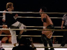 isami再度サッカーボールキック(右写真)から後頭部にドロップキック。石川にタッチ。