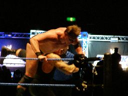 ヘンリーはブレーンバスターのように持ち上げてトップロープに叩きつける。