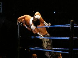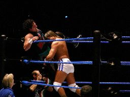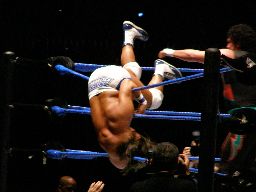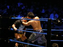 ロープ際のフナキにロンドンを振る、フナキは習性でバックボディドロップ、ロンドンを落としてしまう。