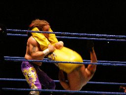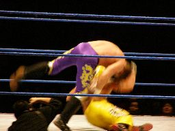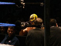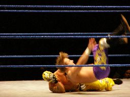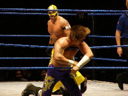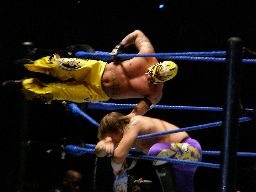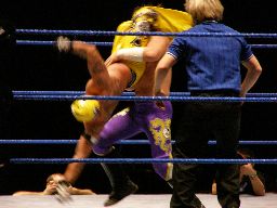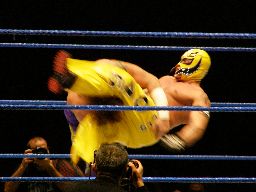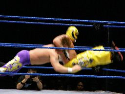 ミステリオ飛びついてウラカンホイップ、キャッシュはセカンドロープ行き。