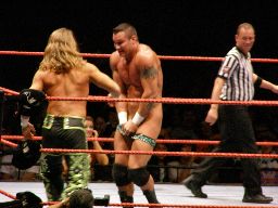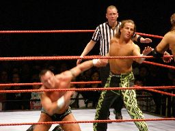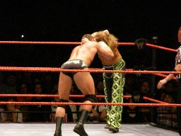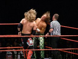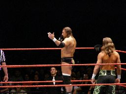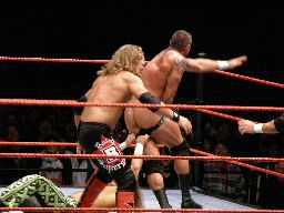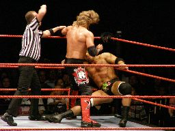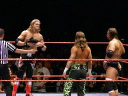 HBKタイツを引っ張る、エッジが助けに入る。