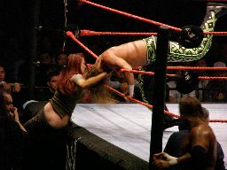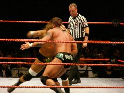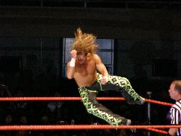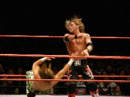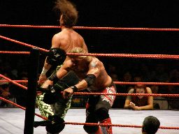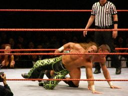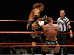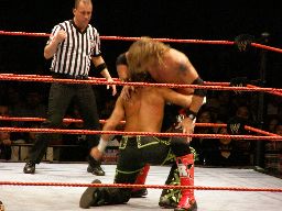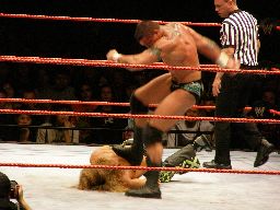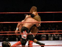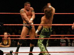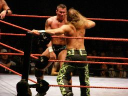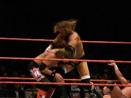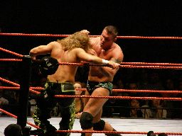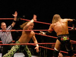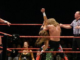 エッジはHBKをコーナーに振ってスピアー、HBKかわす。エッジコーナーにぶつかる寸前でストップ。