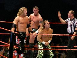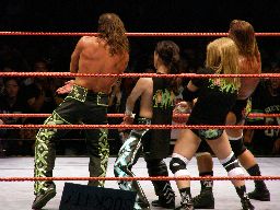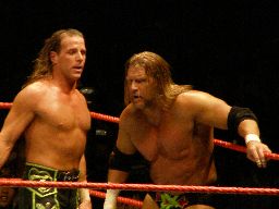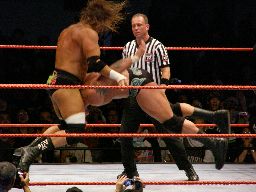 HBKがショルダースルーでエッジを場外に落とす。すぐにスウィート・チン・ミュージックかと思ったがHBKも立てない。