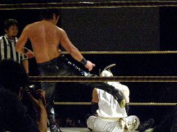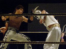 CIMAがフルネルソンでコーナーに連れ帰り超神龍にタッチ。超神龍ドロップキック、ストンピング。ロープに振ってもう一発ドロップキック、カウント2。CIMAが超神龍にMIKAMIをロープに固定して足を持つように指示、しかし超神龍はそれを理解できない(右写真)。言葉の壁?