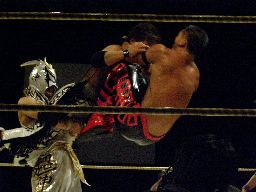 HARASHIMAロープに振る、超神龍フライングニールキック(右写真)。MIKAMIがCIMAにコルバタからトルニージョ、超神龍がケブラーダ、HARASHIMAがプランチャ。CIMAはMIKAMIに妨害されて(?)飛べず。