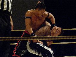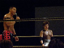MIKAMIコーナーに詰めてパンチからマスクはぎ、レッグホイップからタンヤオ(右写真)に。HARASHIMAにタッチ。