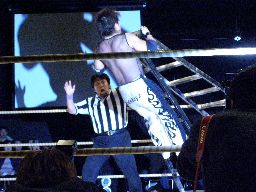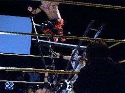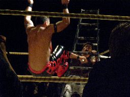 MIKAMIがラダーをセットする。超神龍にはラダー越えのミサイルキック。MIKAMIラダーに上る、CIMAはMIKAMIごとラダーを突き倒す(右写真)。CIMAがMIKAMIの急所にラダーをセットするが場外からHARASHIMAが持ち上げると逆にCIMAの股間にヒット。