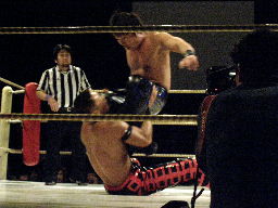 HARASHIMAパイルドライバーからエプロンに出てスワンダイブプレス、カウント2。ミドルキック連打(右写真)からカバー、カウント2。HARASHIMAはMIKAMIにタッチ。20分経過。