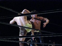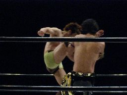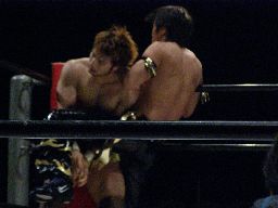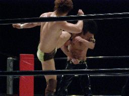 ロープに振ってミドルキック2発(右写真)。3発目KENTAキャッチするがKUDOは延髄蹴り。KUDOコーナーに振って8×4、スワンダイブ狙うがKENTAはキックで撃墜。