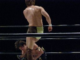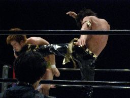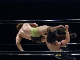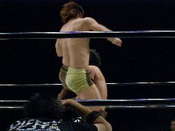 KUDOジャーマン、KENTAすぐに起き上がってバックドロップ。KUDOバックスピンキック、KENTA回転ラリアット、両者ダウン。KENTAビッグブーツ、KUDOカウンターのヒザ蹴り。コーナーに上る。KENTAも上って雪崩式ブレーンバスター狙うがKUDOは張り手でKENTAを宙吊りにするとダブルニードロップ(右写真)。カバー、カウント2。