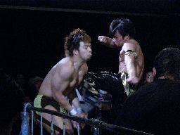 KENTA走り込んでヒザ蹴り(右写真)、KUDOは場外エスケープ。