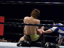 KENTA首投げからサッカーボールキック連打(左写真)。前蹴りからカバー、カウント2。スリーパーに取る、KUDOロープ。5分経過。