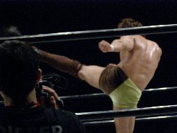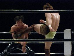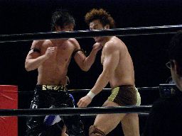 KUDO顔面キック(右写真)。KENTAヒザ蹴り、ヒジ打ち、KUDOダウン。場外に出してミドルキック3連打。