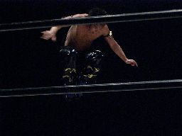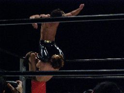 ボディスラムからコーナーに上ってダイビングダブルニードロップ(左写真)、カウント2。